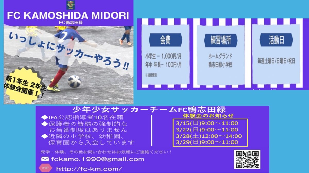 FC鴨志田緑は横浜市青葉区を中心に活動している少年少女サッカーチームです。設立は1990年。横浜市立鴨志田緑小学校をホームグランドとして、永年にわたり地域に根付いた活動を行なっております。